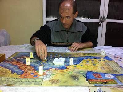 Fácil de jogar, tutorizado, jogamos uma partidinha rápida enquanto o Solon preparava as regras do gigante que veio em seguida...